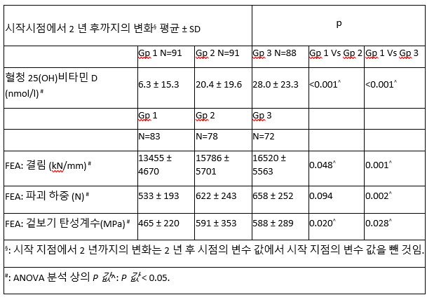 표 1 Mean changes on 혈청 25(OH) 비타민D 수준과 그룹 1, 2, 3에서의 2년 후 유한 요소 분석(FEA) 변수§.