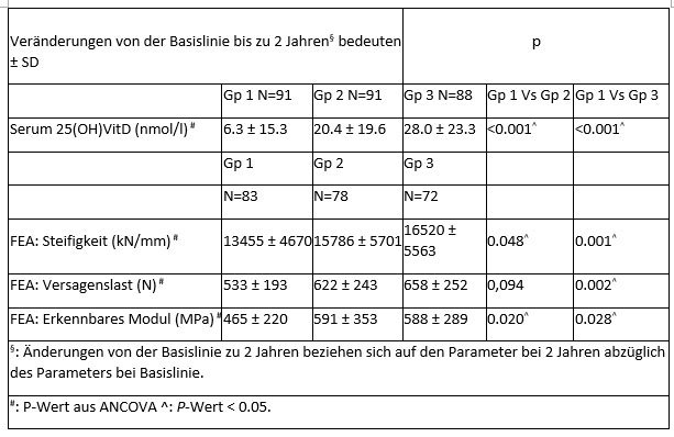 Tabelle 1 Mittlere Veränderungen der Parameter der Serum 25(OH)Vit-D-Spiegel und der Finite-Elemente-Analyse (FEA) bei 2 Jahren für Gruppe 1, 2 und 3§.